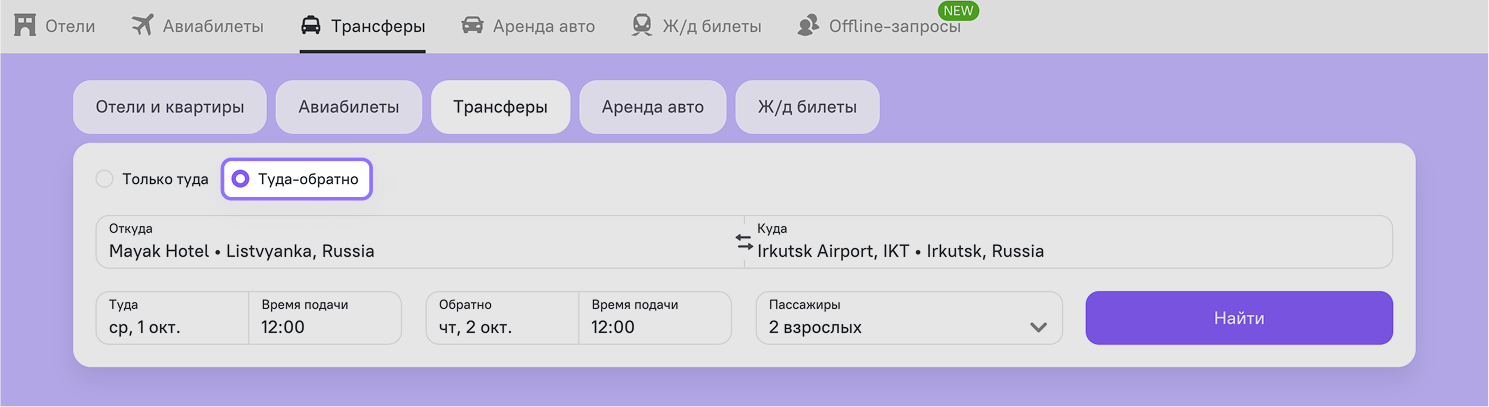 Теперь на Островок B2B вы можете заказать трансфер сразу в обе стороны — не нужно повторять один и тот же процесс бронирования, а значит, можно сэкономить заряд энергии на другие важные задачи. Обе поездки объединяются в связанные заказы, а процесс организации путешествия становится быстрее и удобнее.