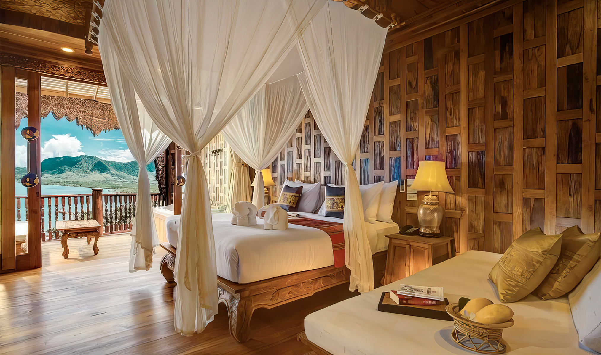 Гости могут остановиться в роскошных номерах или на отдельных виллах, построенных из тикового дерева.